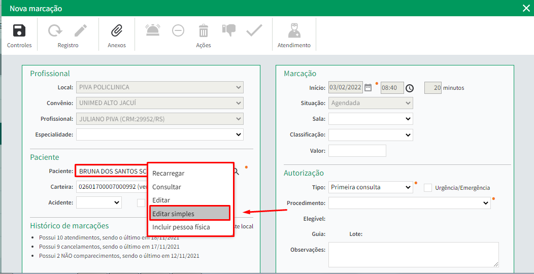Quando na marcação de um paciente retornar que a carteira está vencida deverá conferir se a data certa é a que está no PEP. Se a data está errada deverá altera-la para que assim possa prosseguir a marcação. 1º Na aba de marcação clique com o lado direito do mouse sobre o nome do paciente> clique em "editar simples";