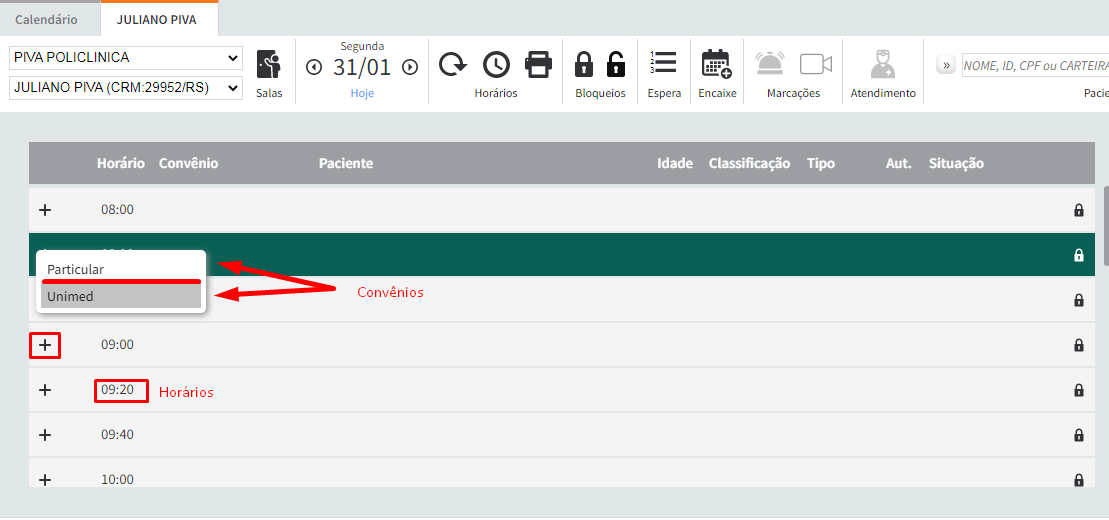 1º selecione o horário que deseja fazer a marcação na agenda. 2º Clique em "+" e selecione o convênio do paciente.